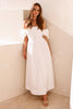 The Bella Off Shoulder Maxi Dress in White is a timeless classic dress for any dressy event. It exudes elegance and effortless especially when paired with while heels and dainty gold adornments.