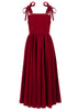 Make an unforgettable entrance in the Mary Dress, a luxurious holiday statement piece crafted to captivate with its exquisite details. Featuring a rich velvet fabric and a flattering square neckline adorned with delicate pearls, this dress embodies timeless elegance. The charming bows on the shoulder add a touch of magic. Complete the look with white, black, or gold accessories for a show-stopping ensemble.