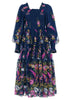 The Songbird Dress is a vibrant celebration of color and nature's beauty, featuring a deep navy base adorned with brilliant floral embroidery. The smocked bodice offers a flattering fit complemented by the voluminous, sheer puffed sleeves. The layered skirt showcases intricate patterns of pink, yellow, and green flowers that evoke the lively charm of a blooming garden. Perfect for both day and evening wear, the Songbird Dress effortlessly blends elegance and playful charm, making it a standout piece in any wardrobe.